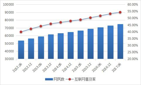 根據(jù)CNNIC最新數(shù)據(jù)顯示,截止2017年6月,我國網(wǎng)民規(guī)模達(dá)到7.51億,半年共計(jì)新增網(wǎng)民1992萬人。互聯(lián)網(wǎng)普及率為54.3%,較2016年底提升1.1個(gè)百分點(diǎn)。我國網(wǎng)民規(guī)模增長趨于穩(wěn)定,互聯(lián)網(wǎng)行業(yè)持續(xù)穩(wěn)健發(fā)展,以互聯(lián)網(wǎng)為代表的數(shù)字技術(shù)正在加速與經(jīng)濟(jì)社會(huì)各領(lǐng)域深度融合,成為促進(jìn)我國消費(fèi)升級(jí)、經(jīng)濟(jì)社會(huì)轉(zhuǎn)型、構(gòu)建國家競(jìng)爭(zhēng)新優(yōu)勢(shì)的重要推動(dòng)力。