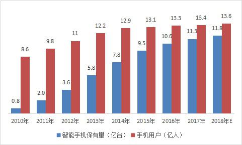 2010-2018年中國智能手機(jī)保有量