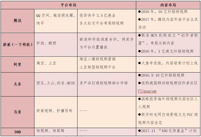 以BAT為首的機(jī)構(gòu)重金加速布局短視頻平臺(tái)。今日頭條、騰訊、秒拍等均投入10億元扶持短視頻內(nèi)容創(chuàng)業(yè)者。阿里投入20億元進(jìn)軍短視頻領(lǐng)域,將土豆網(wǎng)打造為專門的短視頻平臺(tái)。騰訊專門成立短視頻中心,負(fù)責(zé)短視頻平臺(tái)運(yùn)行;愛奇藝短視頻平臺(tái)的愛奇藝頭條正在內(nèi)測(cè);秒拍成為新浪微博獨(dú)家短視頻應(yīng)用,從工具型短視頻機(jī)構(gòu)轉(zhuǎn)型為社交分享類短視頻平臺(tái);華人文化基金領(lǐng)投的資訊類短視頻平臺(tái)梨視頻也已形成業(yè)內(nèi)影響力;咪咕視訊作為中國移動(dòng)在視頻領(lǐng)域的唯一版權(quán)運(yùn)營實(shí)體,也布局短視頻,與中央電視臺(tái)共建業(yè)內(nèi)領(lǐng)先的短視頻創(chuàng)作者聚集平臺(tái),打造頭部賬號(hào)體系,孵化自有明星短視頻賬號(hào),引入知名工作室直接簽約,盤整已有的強(qiáng)IP資源賬號(hào)化運(yùn)作。