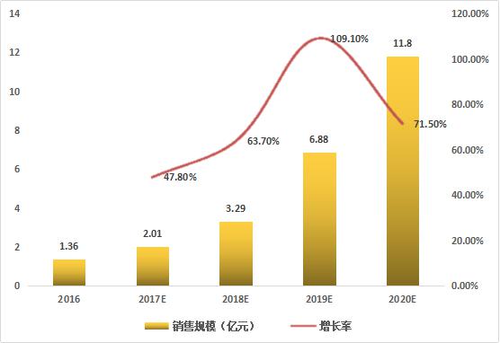 根據(jù)艾媒咨詢數(shù)據(jù)顯示,2016年中國智能音箱銷售規(guī)模為1.36億元,預(yù)計(jì)2017年將突破兩億,達(dá)到2.01億,增長率為47.8%;預(yù)計(jì)到2020年,智能音箱銷售規(guī)模將超過10億元。目前雖眾多廠商已推出智能音箱產(chǎn)品,但市場總體銷售規(guī)模仍處于較低水平,隨著產(chǎn)品進(jìn)一步優(yōu)化升級(jí)及智能家居的推廣,中國智能音箱消費(fèi)市場潛力將得到釋放,行業(yè)有望迎來爆發(fā)式增長。