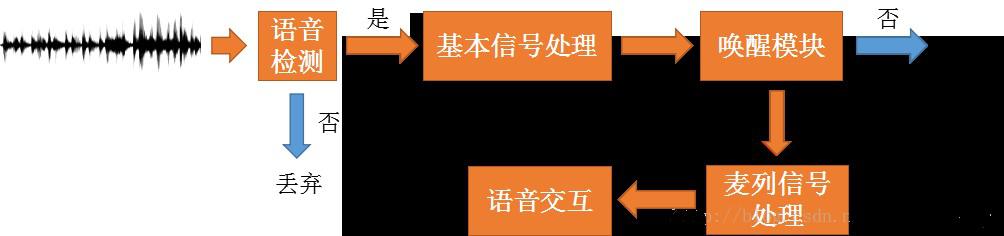 總體而言,音箱工作時(shí),麥列始終處于拾音狀態(tài)(持續(xù)對(duì)聲音信號(hào)進(jìn)行采樣、量化)。經(jīng)過基本的信號(hào)處理(靜音檢測、降噪等),喚醒模塊會(huì)判斷是否出現(xiàn)喚醒詞。如果出現(xiàn)喚醒詞,后續(xù)語音會(huì)進(jìn)行更復(fù)雜的語音信號(hào)處理,(理想情況下)得到干凈的語音信號(hào),開始真正的語音交互流程。