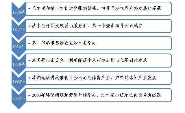沙木尼小鎮(zhèn)(Chamonix)位于法國(guó)中部東側(cè),毗鄰意大利和瑞士,坐落于阿爾卑斯主峰勃朗峰腳下的山谷里。作為現(xiàn)代登山運(yùn)動(dòng)發(fā)源地,長(zhǎng)住居民僅1.3萬(wàn)人的沙木尼被稱為戶外愛(ài)好者的樂(lè)園、滑雪者的天堂,每年需接待超過(guò)200萬(wàn)的登山滑雪者和日常游客。沙木尼小鎮(zhèn)能成為戶外運(yùn)動(dòng)的天堂,原因主要有二:其一,小鎮(zhèn)海拔1035米且位于山谷中,是理想的登山活動(dòng)出發(fā)點(diǎn);阿爾卑斯山的主峰勃朗峰為小鎮(zhèn)帶來(lái)獨(dú)一無(wú)二的登山資源;其二,17868月獵人杰克·巴爾瑪和醫(yī)生米歇爾·帕卡爾兩人首次登上了勃朗峰,引發(fā)了歐洲登山運(yùn)動(dòng)的熱潮,歷史積淀及戶外運(yùn)動(dòng)偏好成就了沙木尼在登山活動(dòng)中的極高地位。