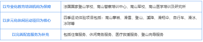 在法國(guó),登山向?qū)?duì)顧客的行為承擔(dān)法律責(zé)任,這些以技術(shù)高超、經(jīng)驗(yàn)豐富,責(zé)任感強(qiáng)而著稱的向?qū)冊(cè)谌澜缍枷碛惺⒆u(yù)。國(guó)立登山滑雪學(xué)校開(kāi)設(shè)的項(xiàng)目有登山向?qū)?、滑雪教練、高山協(xié)作、救援、滑翔傘教練。學(xué)校設(shè)備齊全,配有六個(gè)可容納20至80人的會(huì)議室、一個(gè)可容納220人且配有錄像投影機(jī)的階梯教室、一棟配有132個(gè)標(biāo)間的宿舍樓、一個(gè)自助餐中心、一個(gè)健身房、一個(gè)器材室及其它科研場(chǎng)所。因?yàn)?/b>ENSA的存在,沙木尼成為全球登山標(biāo)準(zhǔn)的定制者,完善的培訓(xùn)和卓越的服務(wù)成為其登山產(chǎn)業(yè)發(fā)展的護(hù)城河。