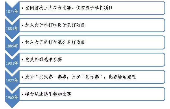 溫網(wǎng)于1877年首次于全英草地網(wǎng)球和門球俱樂(lè)部管理之下在溫布爾登Worpl路附近的一塊場(chǎng)地舉行,當(dāng)時(shí)僅有男子單打比賽。1884年,全英俱樂(lè)部增加了女子單打和男子雙打比賽,女子雙打和混合雙打則在1889年加入。1922年比賽搬遷到到了如今的Church路場(chǎng)地。如同其他3項(xiàng)“大滿貫”賽事,溫布爾登在1968年網(wǎng)球公開(kāi)時(shí)代到來(lái)之前,只對(duì)頂級(jí)的業(yè)余選手開(kāi)放。而之后,溫網(wǎng)是所有職業(yè)選手的圣地。
