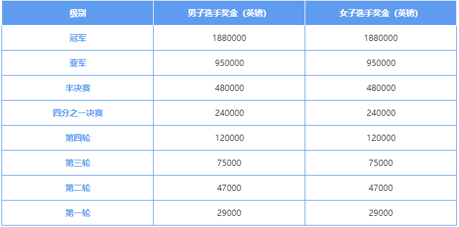 溫網(wǎng)不斷攀升的獎(jiǎng)金也是吸引選手參賽的一大因素。1984年,溫網(wǎng)男子單打冠軍獎(jiǎng)金為10萬(wàn)英鎊,女子單打冠軍為9萬(wàn)英鎊;1985年男單冠軍為13萬(wàn)英鎊;1987年男單冠軍獎(jiǎng)金為15.5萬(wàn)英鎊;1991年男單冠軍獲24萬(wàn)英鎊,女單冠軍獲21.6萬(wàn)英鎊,甚至第1輪遭淘汰選手也可獲得一筆獎(jiǎng)金,男子3600英鎊,女子2790英鎊。如今,溫網(wǎng)已經(jīng)實(shí)現(xiàn)了男女運(yùn)動(dòng)員獎(jiǎng)金持平政策,每年共有2700萬(wàn)磅獎(jiǎng)金,已經(jīng)超過(guò)美網(wǎng)(2600萬(wàn)磅)、澳網(wǎng)(2300萬(wàn)磅)、法網(wǎng)(2200萬(wàn)磅)成為獎(jiǎng)金最多的公開(kāi)賽。