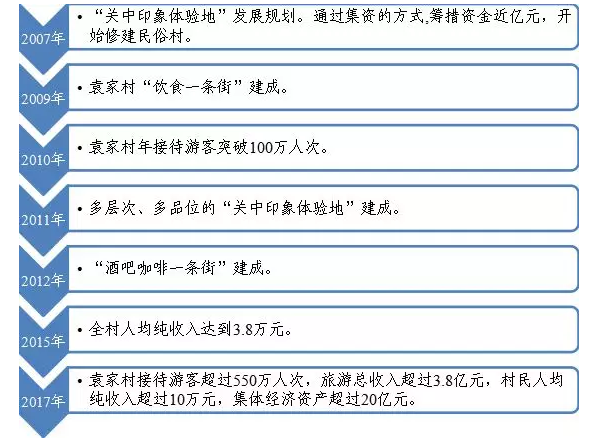 袁家村從2007年開(kāi)始由村委書(shū)記帶領(lǐng)發(fā)展鄉(xiāng)村旅游,通過(guò)將關(guān)中的特有民俗小吃、技藝等與現(xiàn)代文化創(chuàng)意、休閑生活方式相結(jié)合,形成了現(xiàn)在的年游客量過(guò)百萬(wàn)、收入過(guò)億的關(guān)中民俗特色文化旅游小鎮(zhèn)。