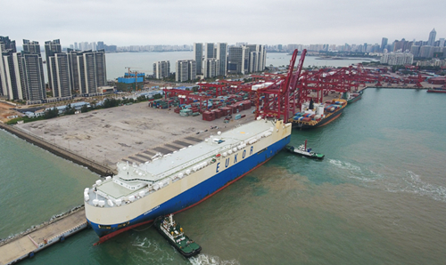 滾裝貨船“勞拉”輪駛?cè)牒?谛阌⒏?,這是海南自貿(mào)區(qū)政策實施以來的首艘汽車外貿(mào)船(2月16日攝,無人機照片)。新華社記者 楊冠宇 攝