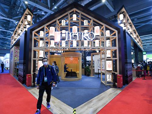 11月10日,觀眾從第三屆進博會食品及農(nóng)產(chǎn)品展區(qū)日本貿(mào)易振興機構(gòu)展臺走出。新華社記者 陳曄華 攝