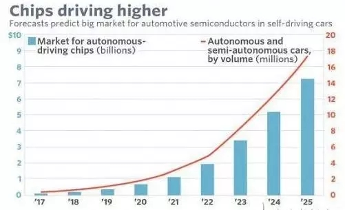 以無(wú)人駕駛汽車(chē)的智能化趨勢(shì)為例,摩根大通估計(jì)到2025年,用于無(wú)人駕駛汽車(chē)的半導(dǎo)體器件銷(xiāo)售額可達(dá)73億美元,從2017年到2025年的年復(fù)合增長(zhǎng)率高達(dá)62.5%。2015年全球汽車(chē)半導(dǎo)體總銷(xiāo)售額不過(guò)300億美元,摩根估計(jì)平均每部車(chē)用到的芯片價(jià)值將從現(xiàn)在的300至400美元增長(zhǎng)到2025年400至500美元。