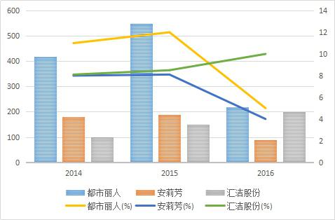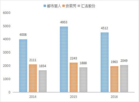 考慮到使用萊卡材料內(nèi)衣企業(yè)主要是中高端企業(yè),企業(yè)占市場份額較大,數(shù)據(jù)可獲取等因素,本部分主要針對中高端內(nèi)衣企業(yè)安莉芳集團(tuán)(以下簡稱為:安莉芳)、深圳匯潔集團(tuán)股份有限公司(以下簡稱為:匯潔股份)、大眾性企業(yè)廣東都市麗人實業(yè)有限公司(以下簡稱:都市麗人)進(jìn)行分析。